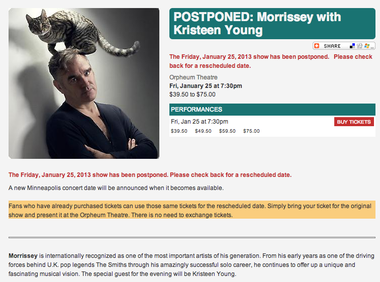 Elaborate plans to see Morrissey TWICE and he cancelled again. This was communicated the morning of the event. I had just gotten a call about dinner reservations for the evening and confirmed I was coming. Then I got this email. I’m getting my money back, not going for the second reschedule (and possibly third cancel).